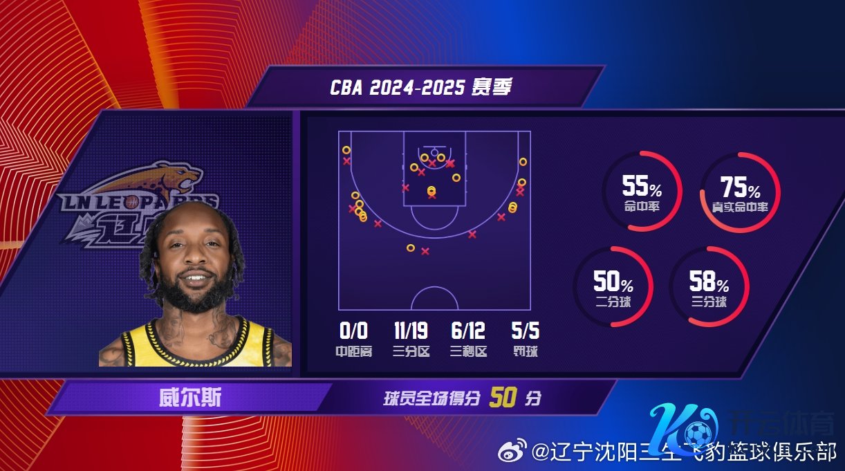 本场比赛,辽宁外助威尔斯大发神威,他出战43分31秒,31投17中,其中三分19中11,另外罚球5中5,砍下50分2篮板6助攻2抢断,率队取胜!