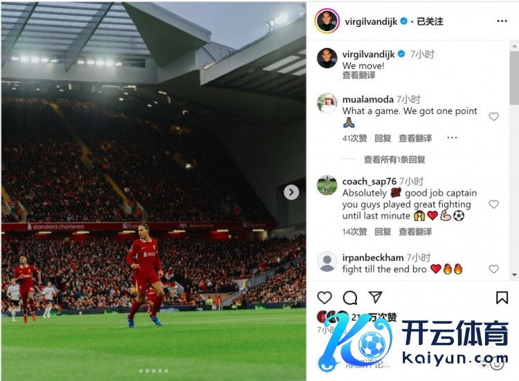 范迪克赛后在外交媒体上晒出我方的比赛像片,并配文:“咱们持续前进!”