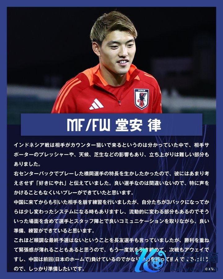 堂安律:“在对阵印度尼西亚的比赛中,天然咱们预猜想敌手会遴选反击战略,但受到对方球迷施加的压力以及天气和草皮等成分的影响,开局如故遭逢了一些勤恳。为了走漏担任右中卫的桥冈选手的特色,我颠倒让他"解放走漏",尽量不让他思得太多。他照实是又名出色的球员,即使不需要终点的教导,他也能展现出精彩的推崇。”
