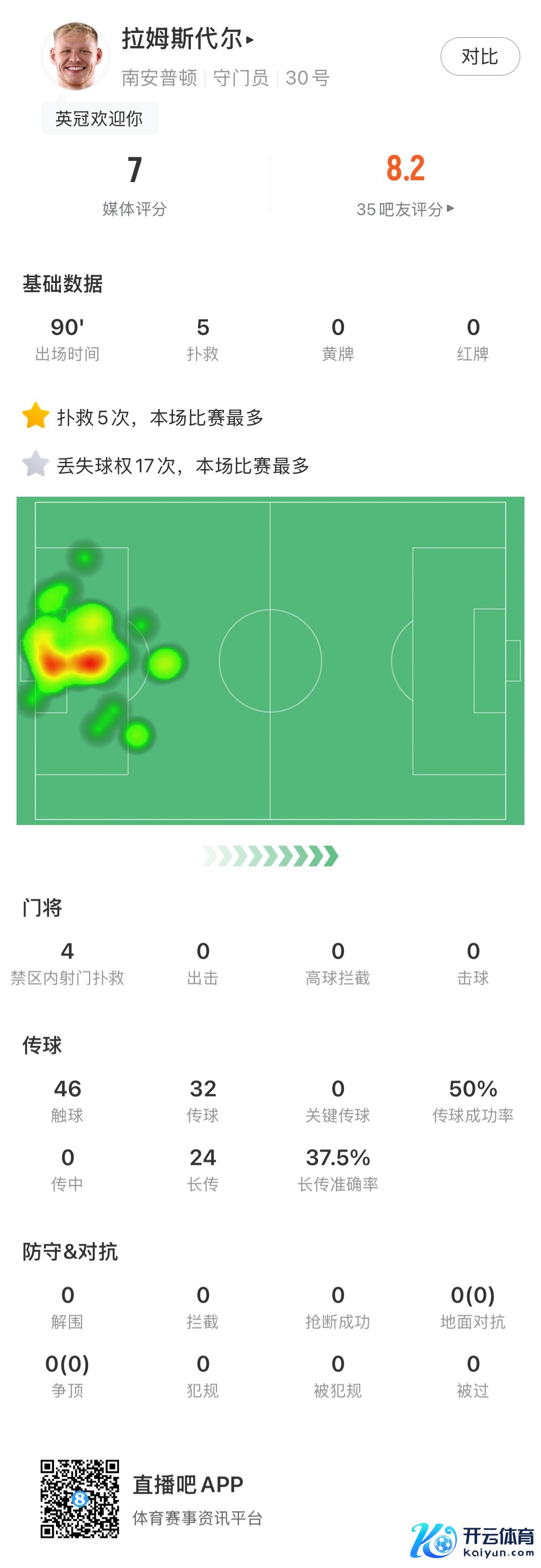 本场比赛拉姆斯代尔孝敬5次扑救,但球队仍然惨败给敌手。当今南安普顿英超1胜3平16负,排在英超垫底。